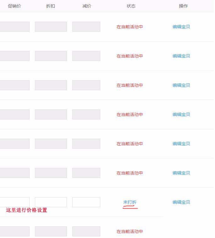 10、此時在打開的界面中你會找到“在當前活動中”的寶貝和“未打折”的寶貝,選擇“未打折”的寶貝進行編輯就可以了。