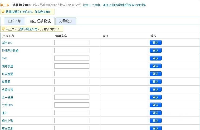 4、選擇自己聯系物流-快遞類型-輸入快遞單號-確認