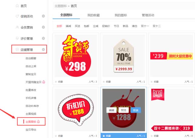 2、在左側的快捷菜單欄我們選擇“店鋪管理”-“主圖圖標”,選擇自己中意的圖標進行“編輯”。