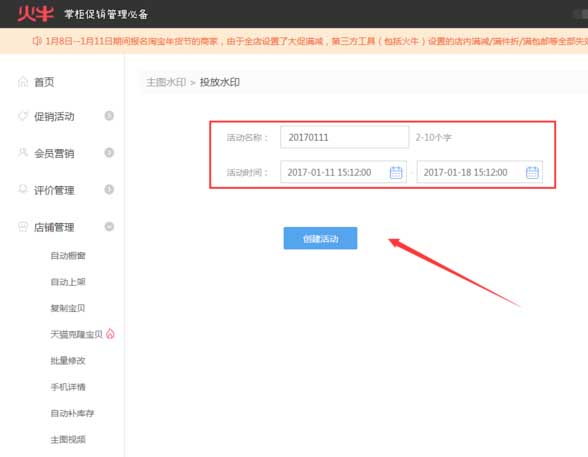 4、編輯好后,選擇之前編輯的主圖圖標進行投放,點擊“投放”,設置活動名稱、時間后點擊“創建活動”。