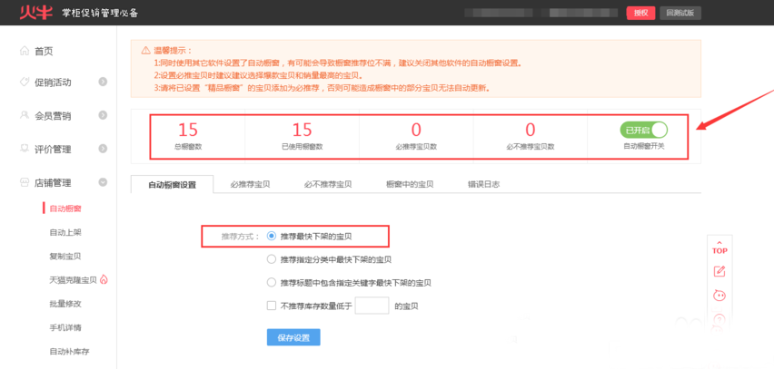 3、進入到功能操作界面,我們在最上方,會看到店鋪櫥窗的使用情況。然后,往下看會看到選擇櫥窗自動推薦的方式,這里我們選擇“推薦最快下架的寶貝”。目的就是在獲得下架權重的同時獲得櫥窗推薦的權重。
