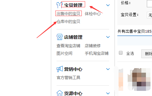 7、如果已經(jīng)發(fā)布了寶貝,淘寶提示寶貝類目不合適,需要修改,我們可以通過路徑“賣家中心”-“寶貝管理”-“出售中的寶貝”找到自己發(fā)布的寶貝。