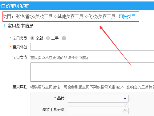 6、進入了發(fā)布寶貝編輯頁面以后,我們就可以在最上面看到自己將要發(fā)布寶貝的類目,如果覺得不合適也可以修改,直接點擊后面的切換類目就可以了。