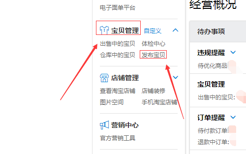 2、進入淘寶首頁以后,我們找到右上角的“賣家中心”,點擊進入賣家中心以后,找到“寶貝管理”,再找到寶貝管理里面的“發(fā)布寶貝”。