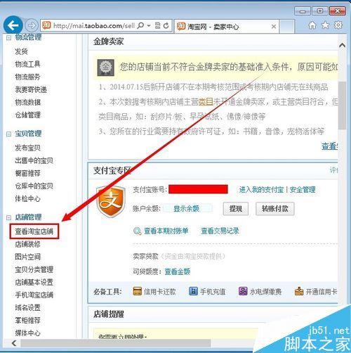 在打開(kāi)的賣家中心設(shè)置頁(yè)面里,我們?cè)谧筮呎业降赇伖芾恚缓簏c(diǎn)擊里面的“查看淘寶店鋪”選項(xiàng) 如圖