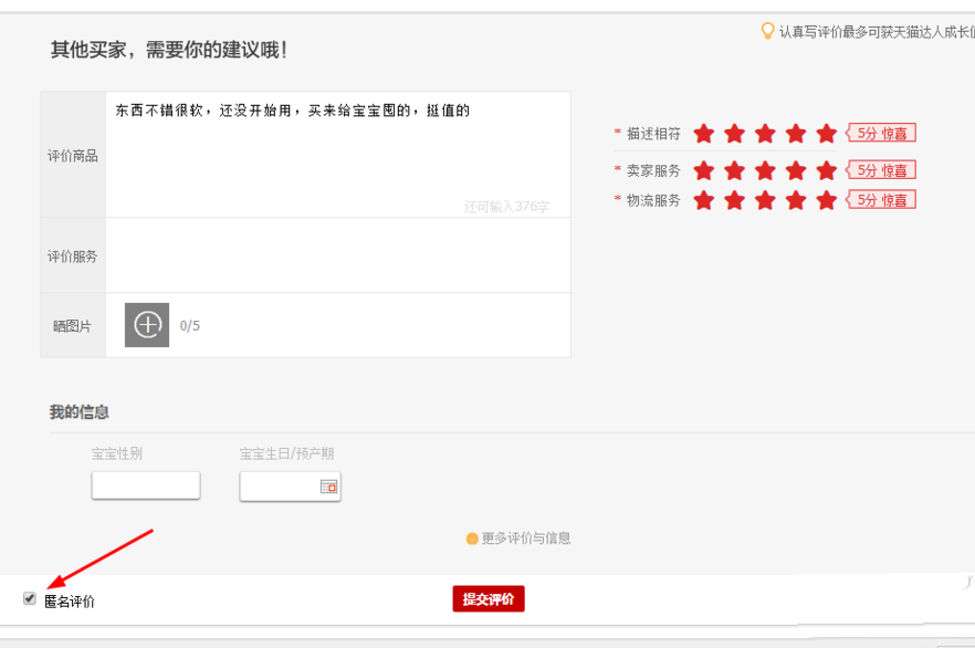 4、編輯好你要表達的文字,傍邊的五星按你的滿意程度去選,也可以跟我一樣全選五星,然后勾選下面的匿名評價,如圖