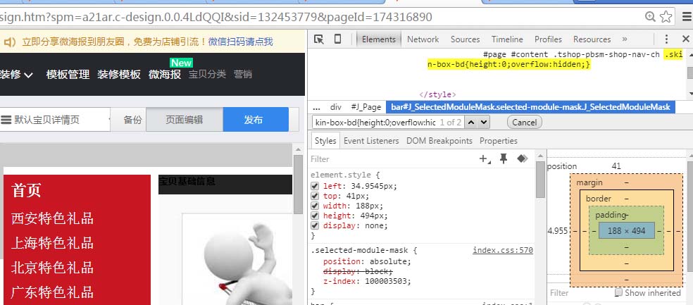 2、用CSS代碼隱藏了的導航條模塊即使在后臺的裝修頁面也是看不到的。連編輯按鈕都一并隱藏了。