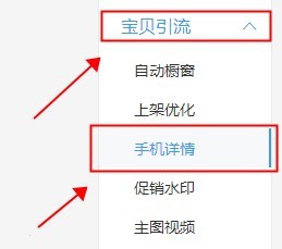 2、首頁(yè)點(diǎn)擊左側(cè)工具欄【寶貝引流】—【手機(jī)詳情】進(jìn)入,如下圖: