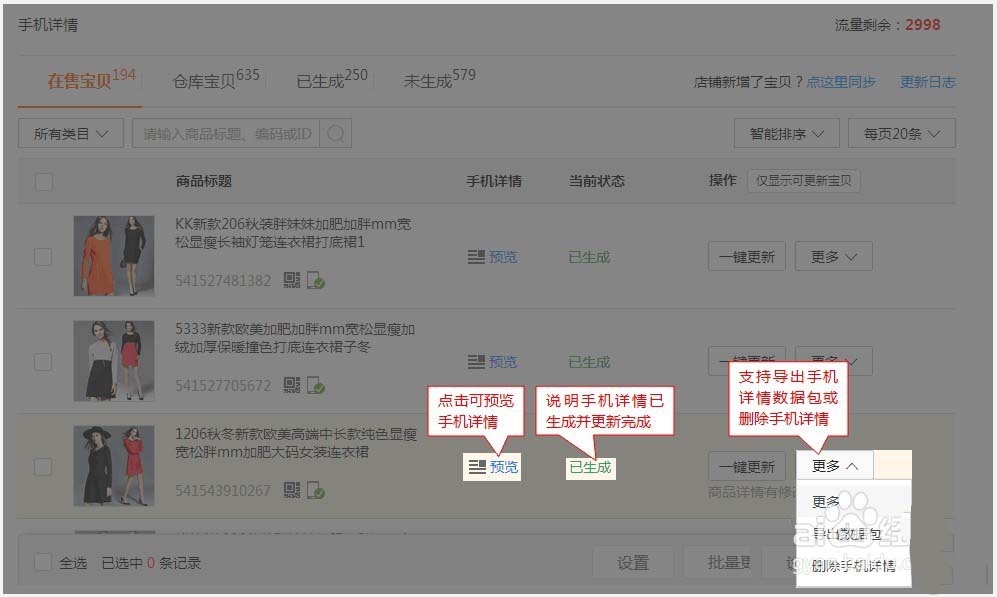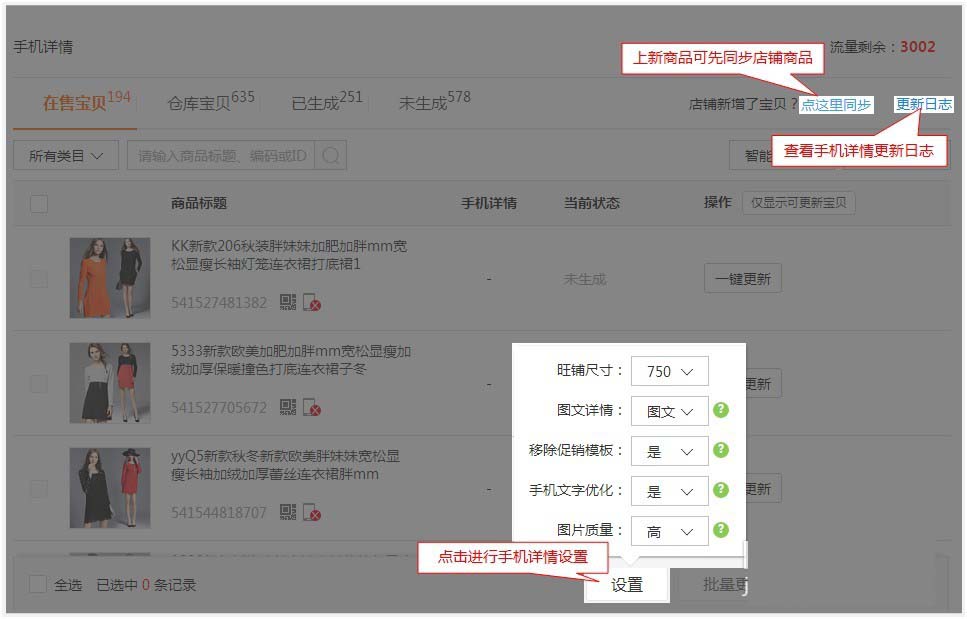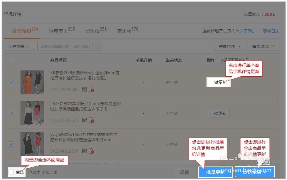 4、勾選商品,點(diǎn)擊右下角【批量更新】,浮出提醒,如下圖: