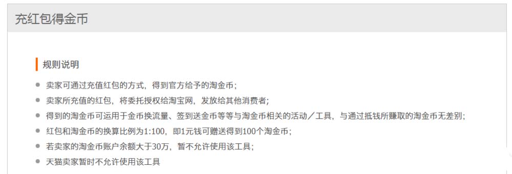 3、在充值前,我們先來看看詳細的規則說明,里面有說明兌換率:1元錢=100淘金幣。這個工具目前只限于c店賣家。