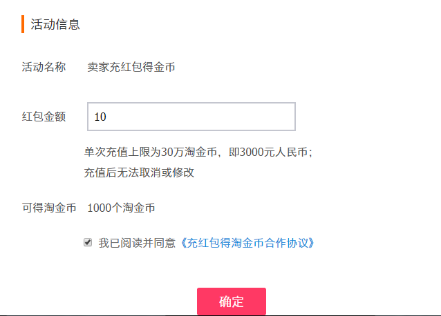 4、在下方,我們填寫要充值的金額。我這邊先填個10元,下方馬上會顯示能夠獲得的淘金幣數量。然后勾上同意,再點擊下方的確定。
