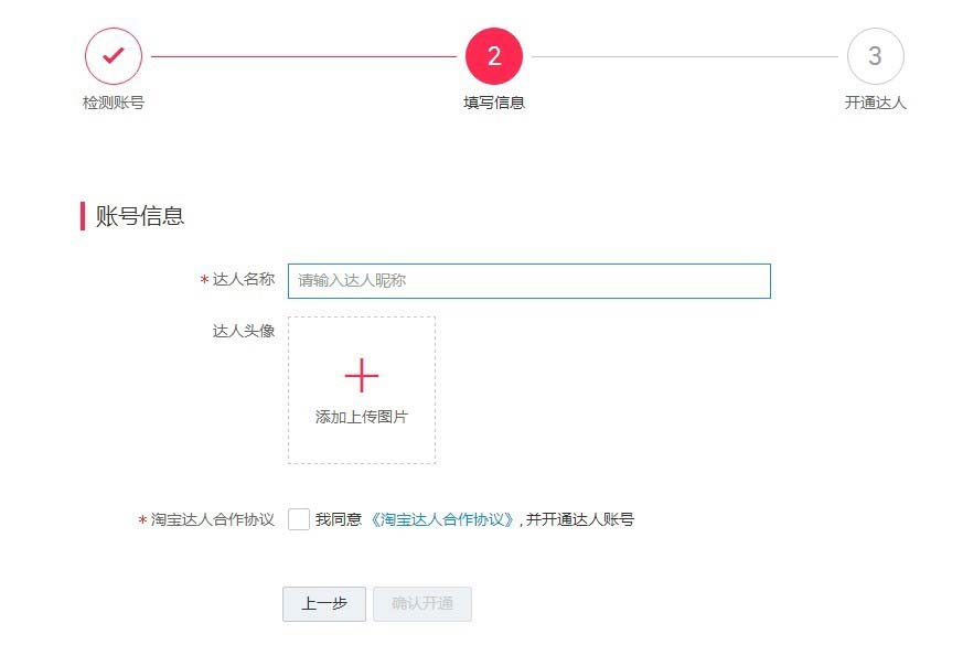 3、點擊下一步后,會提示您達人名稱的填寫和頭像的上傳,這里的名稱和頭像在申請后是可以修改的,可以放心填寫。