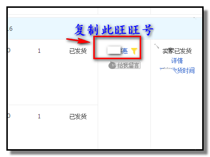 3、“已賣出的寶貝”這個頁面,當前顯示的是“近三個月訂單”的所有訂單(點擊三個月前訂單就顯示三個月前的所有訂單),每一筆訂單顯示著該買家的旺旺號,復制此旺旺號