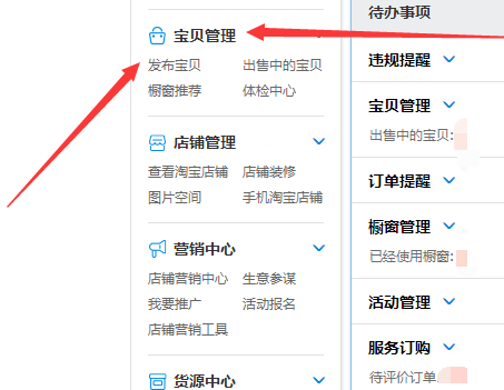 4、點(diǎn)擊賣家中心進(jìn)入之后,點(diǎn)擊寶貝管理,點(diǎn)擊發(fā)布寶貝。