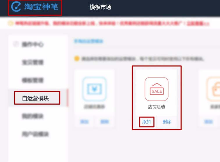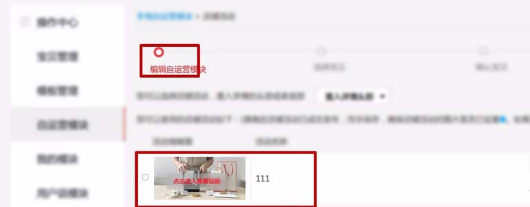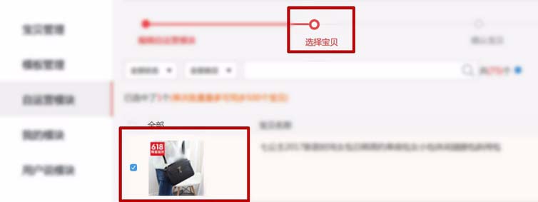 7、點擊店鋪活動/添加,選擇剛剛推送成功的頁面,點擊下一步;選擇自己要添加的寶貝,點擊下一步,同步成功后,就可以觀看效果啦。
