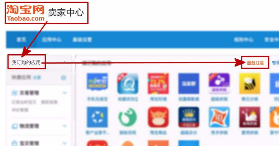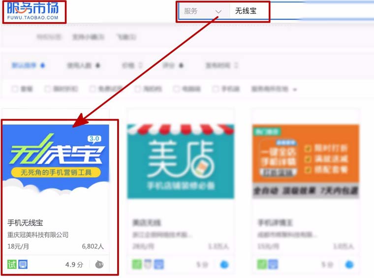 2、點擊進入淘寶賣家中心/我訂購的應用/服務訂購,進入服務市場頁面;搜素無線寶,訂購試用版。