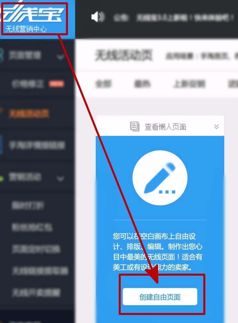 3、點擊進入我的服務訂購/無線寶,進入無線寶首頁,選擇無線端活動頁/視頻頁面,進行視頻編輯,選擇創建自由頁面。