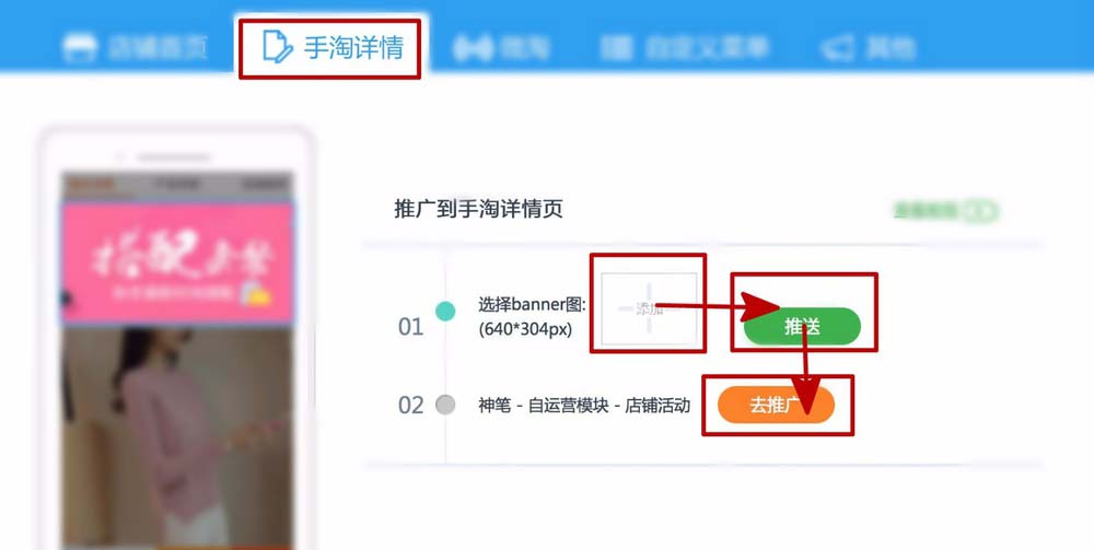 6、點擊保存并返回上一頁,再點擊立即保存,再點擊手淘詳情;添加banner圖,注意尺寸640X304,上傳成功后,點擊推送,出現推送成功提示;點擊去推廣,便進入神筆/自運營模塊。