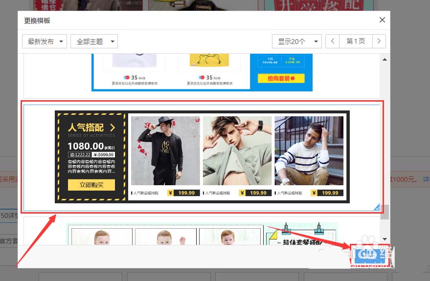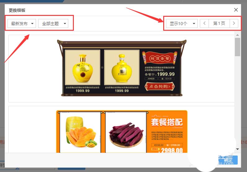 4、點擊【更換模板】進入更換模板頁面,在左上角可以通過指定條件篩選模板,在右上角可以設置當前頁面顯示模板個數以及展示第幾頁的模板。找到合適模板后,鼠標單擊選擇后,點擊頁面右下角【確定】按鈕。