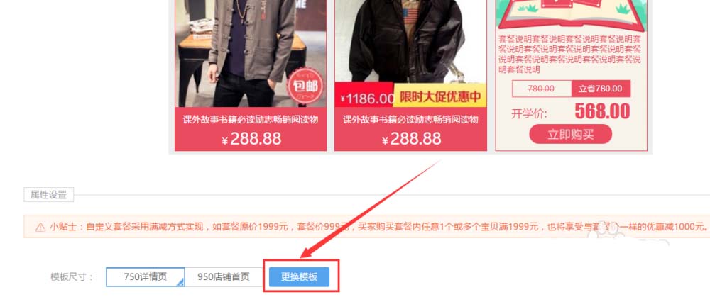 3、在搭配套餐設置頁面選擇【創建套餐】標簽,進入新搭配套餐設置頁面。在該頁面可以預覽搭配套餐的效果,在【屬性設置】模塊,根據搭配套餐投放的位置,選擇套餐模板的尺寸。