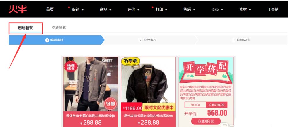 2、在火牛首頁導航欄找到【促銷】中的【搭配套餐】選項,點擊進入搭配套餐設置頁面。