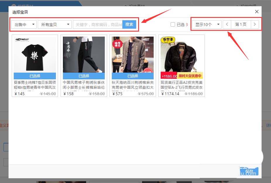 5、設置搭配套餐,搭配套餐設置方式可以選擇【官方套餐】和【自定義】兩種,演示的為【自定義】套餐。勾選【自定義】標簽,點擊后面的【選擇】按鈕,進入【選擇寶貝】窗口,在窗口頂部通過推薦條件篩選寶貝,選擇每頁展示寶貝數量等信息。勾選參加搭配套餐活動的寶貝,點擊頁面右下角【確定】按鈕。