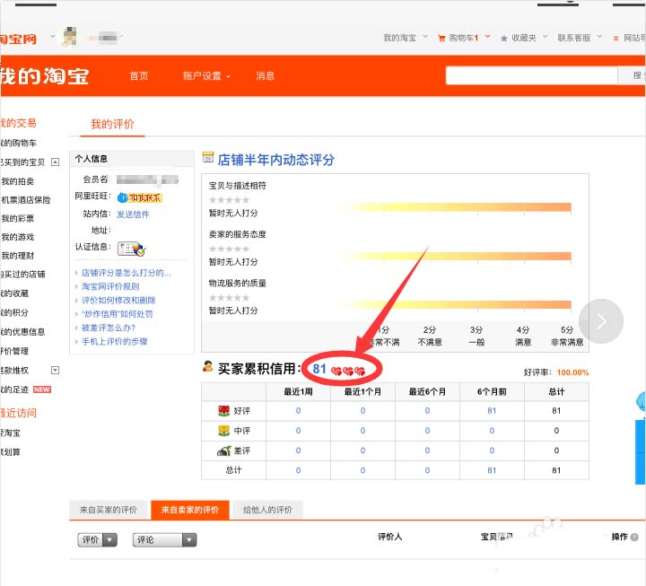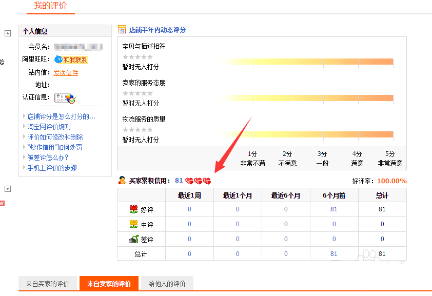 5、如圖進入評價管理以后就可以查看自己店鋪最近半年的動態評分和買家信用星級