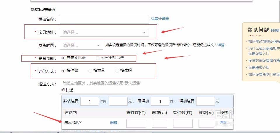 4、創建物流模板名稱,寶貝發貨地址,計價方式等信息;若是包郵,在是否包郵,購選“賣家承擔運費”即可