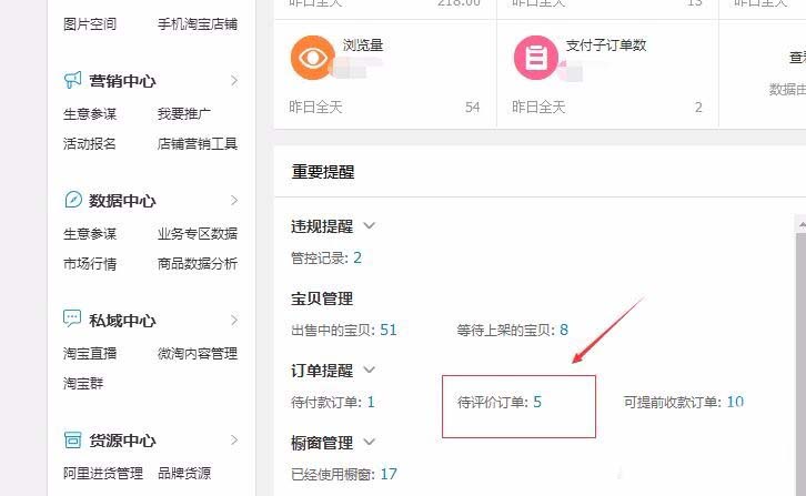 2、在后臺(tái)的首頁(yè)中,重要提醒板塊找到“待評(píng)價(jià)訂單”