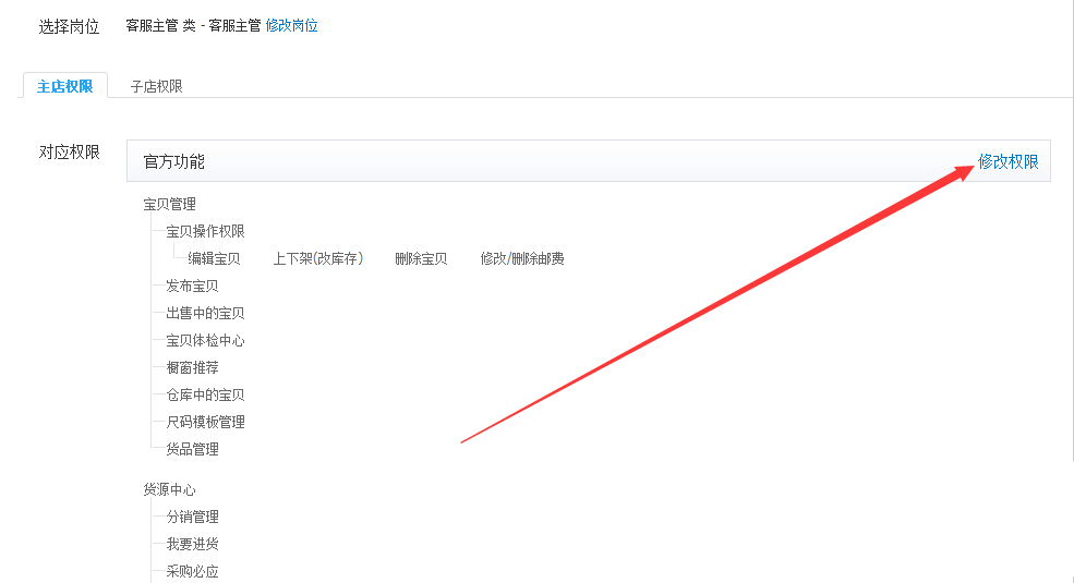 3、對【官方功能】進行修改權限(此處修改的權限適用于子賬號登錄網(wǎng)頁版賣家中心時使用)