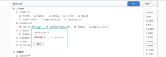 7、點擊藍色的金額數(shù)字,即可設置子賬號操作退款金額的權限。完成修改后再次點擊保存即可。