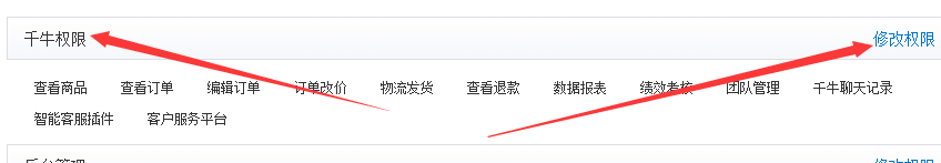 8、對應于PC千牛端操作退款的權限,需要單獨配置,再次進入到第2步的子賬號權限修改入口頁面,下拉到最下面,有一個大標題為【千牛權限】的入口,點擊右側的修改權限按鈕。勾選【查看退款】和【操作退款】的權限,保存即可。