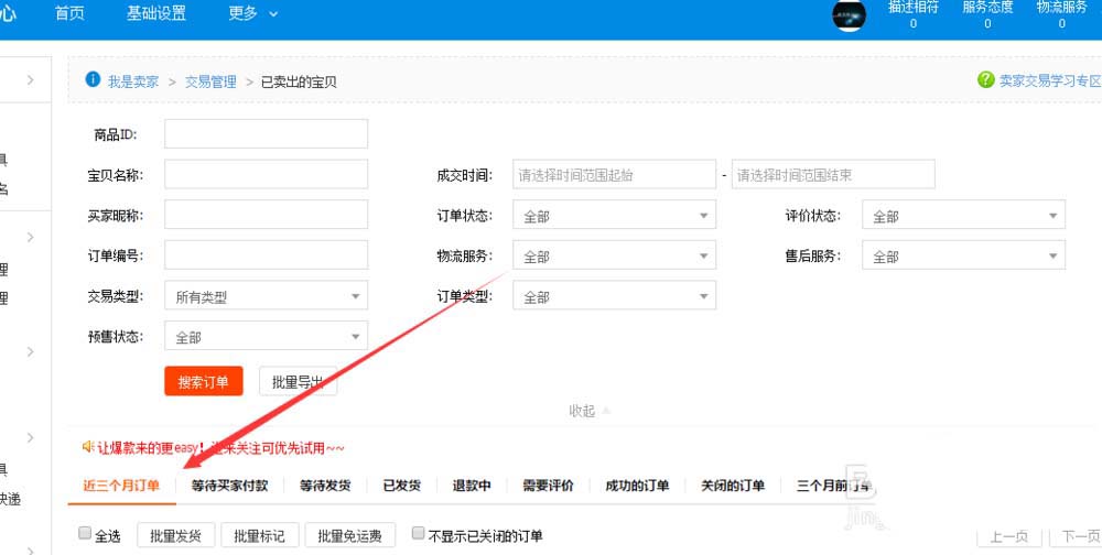 4、等待頁面跳轉(zhuǎn)到賣出寶貝頁面,這個時候系統(tǒng)會默認(rèn)選擇近3個月的訂單,都會展示在這個頁面下。