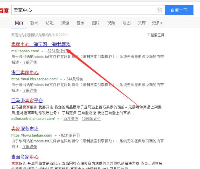 1、首先需要進入賣家中心,同樣進入賣家中心的入口用很多,可以從淘寶頁面進入或者千牛直接進入。當然也可以和小編一樣使用百度搜索賣家中心進入,如下圖所示
