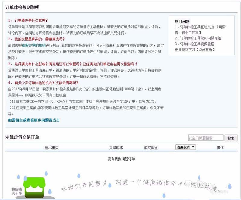 4、店鋪體檢中心專門針對虛假交易作出了訂單清洗功能,買家只需要打開這個選項系統就會排查出疑似需要清洗的訂單,清洗過后的訂單不會被虛假交易處罰 ,但同時評價銷量也都沒有了,這算是一種補救措施。