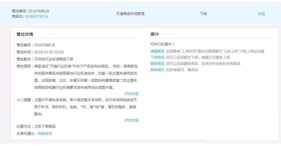 3、管控記錄里面詳細的記載了店鋪和商品因何種原因作出了什么處罰。這里如果是虛假交易則會被清除訂單評價,如果是圖片類目違規信息則會被下架商品,需要重新編輯上架。