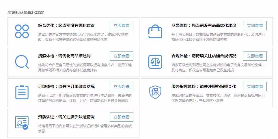 1、我們依次打開店鋪后臺寶貝管理-體檢中心,這里會顯示店鋪的健康等級、違規處理信息、市場管理,同時還會對店鋪和商品出優化建議。