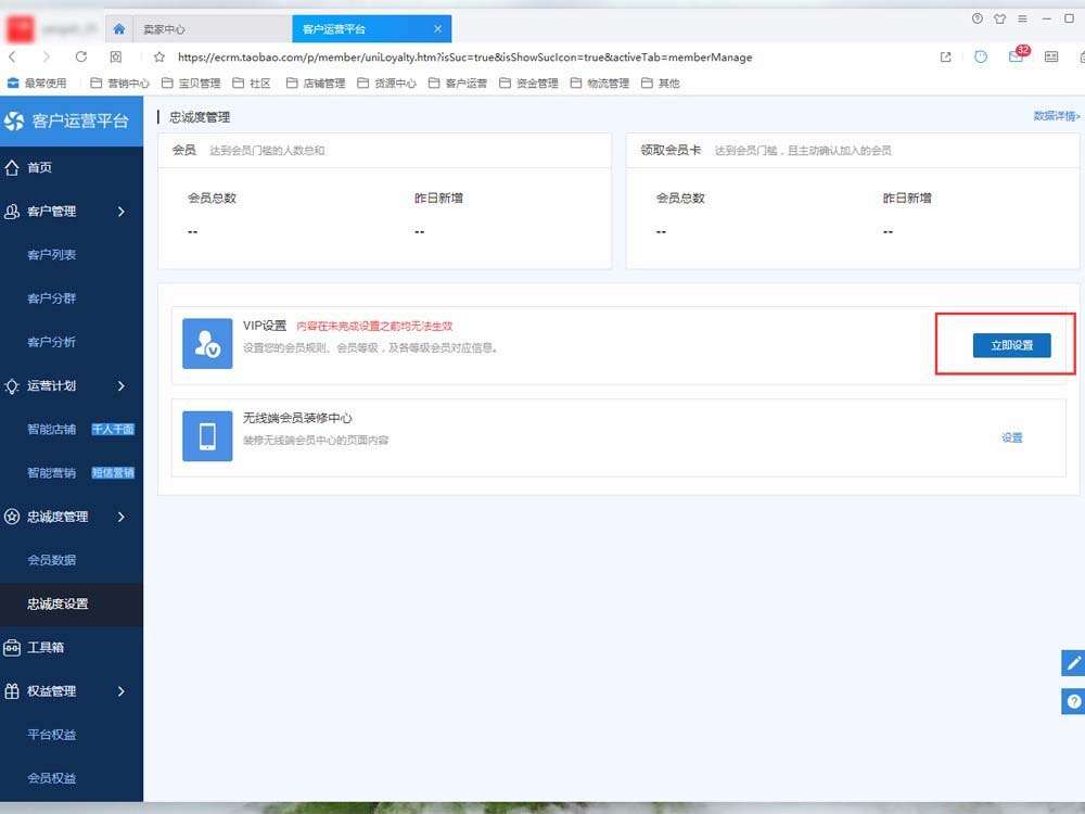 5、點擊【立即訂購】后,就可以看到【忠誠度管理】的頁面了。然后找到【VIP設置】點擊右側的【立即設置】進入到設置頁面。