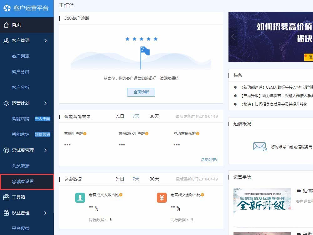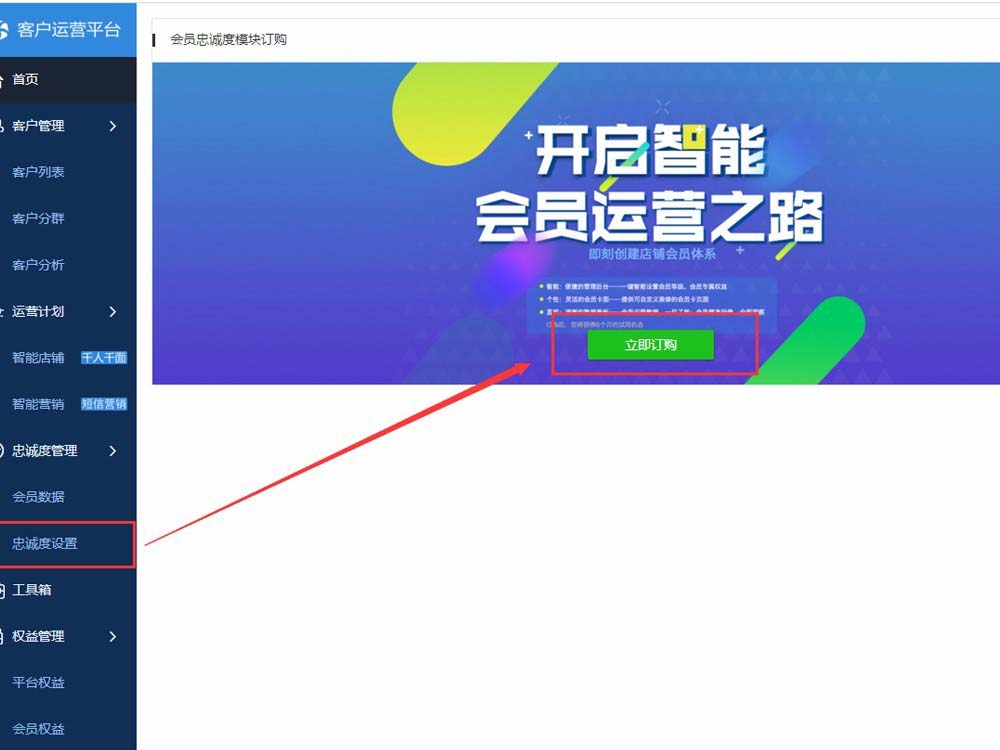 3、在【客戶運營平臺】中心左側菜單欄找到【忠誠度管理】,點擊【忠誠度設置】。