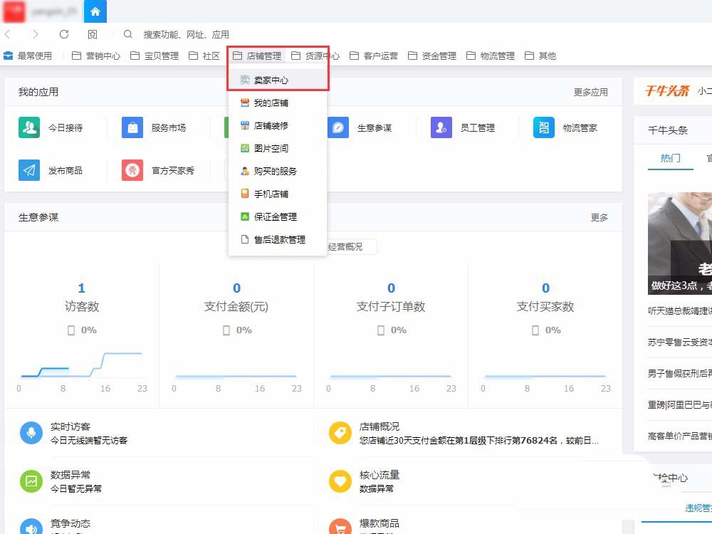 1、打開千牛賣家工作平臺,在頂部【最常使用】列表中點擊【店鋪管理】,在下拉列表中點擊【賣家中心】。