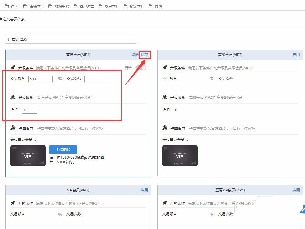 11、繼續把VIP會員和至尊VIP會員的門檻,四個都設置完成后點擊【保存】。