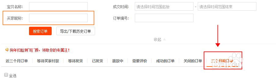 3、然后點擊“已賣出的寶貝”,進去之后將買家的旺旺號粘貼進去就可以了,記得選“三個月前的訂單”。