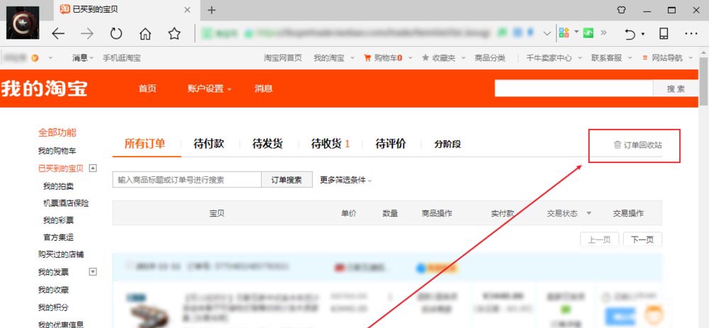 3、在已買到的寶貝頁面,點擊【訂單回收站】