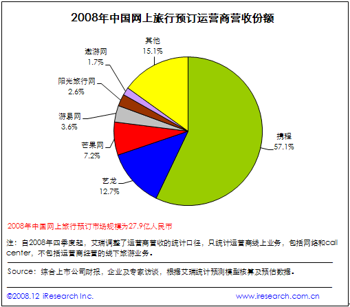 2008年,中國網上旅行預訂市場仍然保持著攜程一家獨大,藝龍、芒果占據第二陣營,其他廠商瓜分剩余市場的競爭格局。