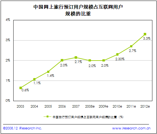 艾瑞咨詢同時根據CNNNIC統計的中國互聯網用戶數量,截止2008年底中國互聯網用戶人數接近3億人,網上旅行預訂用戶數量占互聯網用戶數量的比例為2%,與2007年基本持平。雖然08年使用網上旅行預訂服務的用戶有33.3%的增長,但由于新晉互聯網初級用戶眾多,而旅行預訂又非常態化的應用,所以這一比例基本未變。