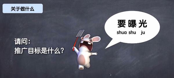 你去問一個做策劃方案的人員,請問你這個方案的推廣目標是什么?他回答你:要曝光,要越多越好的曝光。好的,曝光,可曝光是一個正確目標嗎?當然不是!一個正確的目標要有一條明確的時間線和有一個可以計量的數據結果。如果你沒有確定好一個目標,那你做的策劃就相當于是一坨屎,你會為了你的曝光的目標去刷數據,可刷數據有用嗎?這對公司的業務一點作用都不起。。