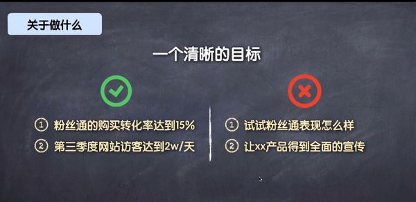 【我們做方案的時候要有一個清晰的目標,清晰的目標會有一條明確的時間線和有一個可以計量的數據結果】我們看看,左側是2個清晰的方案目標,(粉絲通的購買轉化率應達到15%,這個目標前要加個時間點,我們就說8月份吧)有時間點,有具體的結果。而右側則是2個含糊不清的目標,比如讓xx產品得到全面的宣傳,什么叫全面的?請問什么叫全面的?如果是這樣的一個含糊的目標,我又怎么去分解這樣的一個目標呢?分解我的工作步驟呢?根本就無法分解,所以就導致你做的每一件事情都沒有目的性。