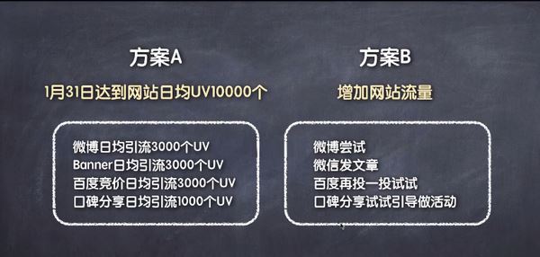 為什么呢?當我們去分解這個目標的時候,發現根本就不知道從何下手阿,我們可以清楚的看到:要想達到方案A 的目標,我們是可以直接分解成【微博日均引流3000個UV ,Banner 人日均引流3000個UV 等等】
