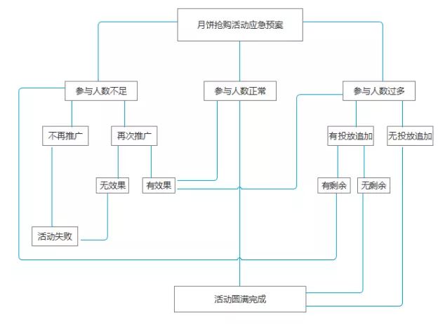 活動運營在設計活動時應考慮到活動中可能遇到各種突發情況,做好相對預案應對措施,并在活動進行中一旦發現問題迅速啟動應急預案。在這個案例中除了活動正常進行,還要考慮到活動參與人數不足怎么辦,要不要再次推廣通知;活動過于火爆,大部分搶不到怎么辦,投放的月餅禮盒數量會不會有追加,這些都需要提高考慮到并做好應對措施。活動運營做活動預案可以文字寫下來,也可以做成預案流程圖,任何形式都行,但一定要考慮周全,把邏輯理順。