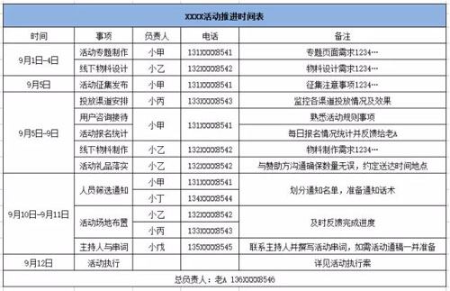 在各項準備工作有條不紊推進的過程中,活動負責人還要制作一份活動現場執行方案,結合設定的活動流程,把簽到、主持、攝影、道具、場務、直播等現場執行中的各項工作分配到具體個人,執行方案一般精確到分鐘。在線下執行之前的一兩天,召集所有執行人員開活動動員會,下發執行方案,逐項分解任務到個人,保證每個人都清楚自己到現場應該做什么工作。